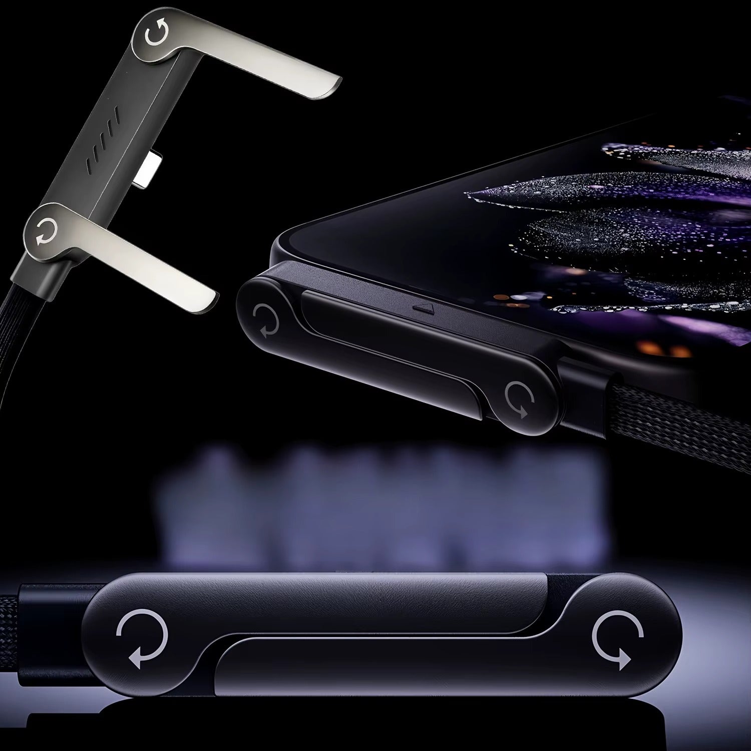 Koniec z rozwalonym kablem przy gnieździe do ladowania telefonu. Przejdz na inny poziom ładowania z Plugzy™. Składany uchwyt na telefon z plecionym kablem USB‑C (C do C) do szybkiego ładowania aż do 240 W — idealny do grania, streamowania i używania telefonu w trakcie ładowania. Konstrukcja łokciowa 90° poprawia komfort chwytu i zmniejsza przeszkadzanie kabla podczas rozgrywki.